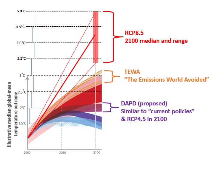 First, RCP8.5 has long been out-of-date, but now there is an unquestioned community consensus on this point. In the new scenario space, RCP8.5 (and similar scenarios, like SSP3-7.0) are grouped into a class that we might characterize as counterfactual fiction — they call such scenarios The Emission World Avoided (TEWA). The pre-print has some internal contradictions, as it also states that the TEWA category, “Could lead to the false impression that the difference with this avoided scenario is the exclusive result of successful climate policies . . .”.
