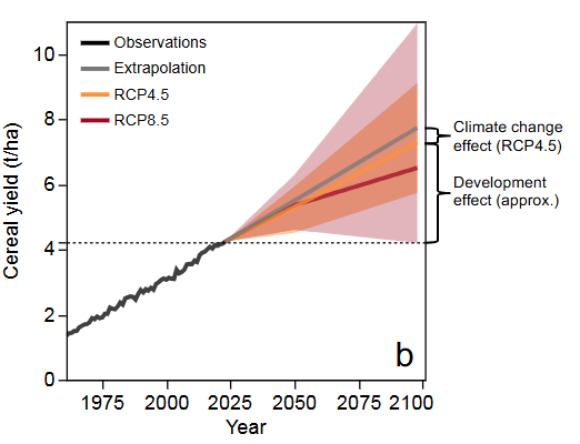 But one does not need math expertise to understand our analysis, with an example visualized in the figure below. The figure shows that the projected impact of climate change on cereal yields is dwarfed by the effect of development, based on analyses found in the literature and combined in our paper.