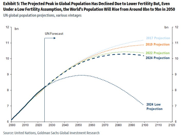 The figure below, from a recent report by Goldman Sachs, illustrates the recent downward trend in United Nations medium population projections for the rest of this century, along with the UN low-fertility scenario that JFV estimates to be more likely.