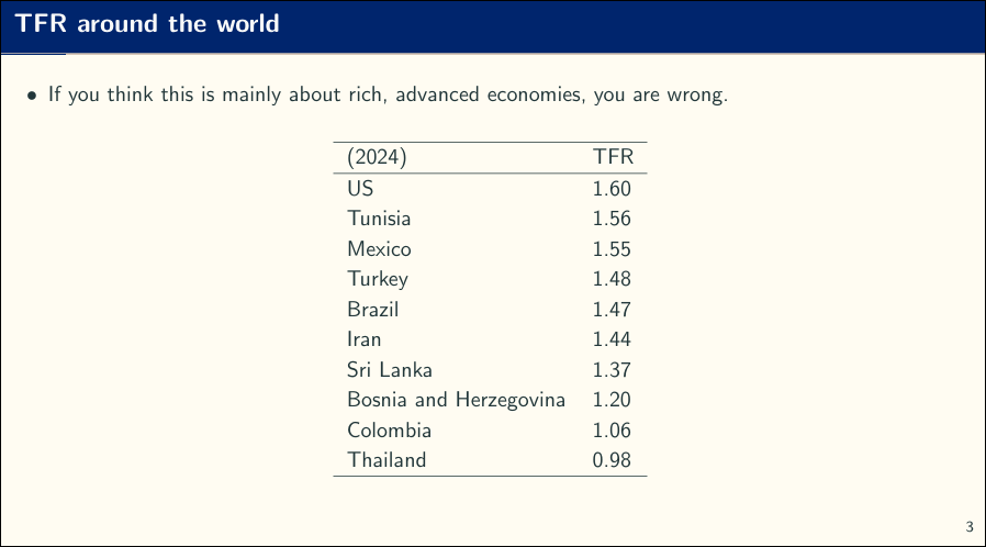 Is a total fertility rate of 1.2 a plausible scenario for the long-term future? Let’s return to the recent talk of Jesús Fernández-Villaverde, who included the slide below showing 2024 fertility rates for various countries.