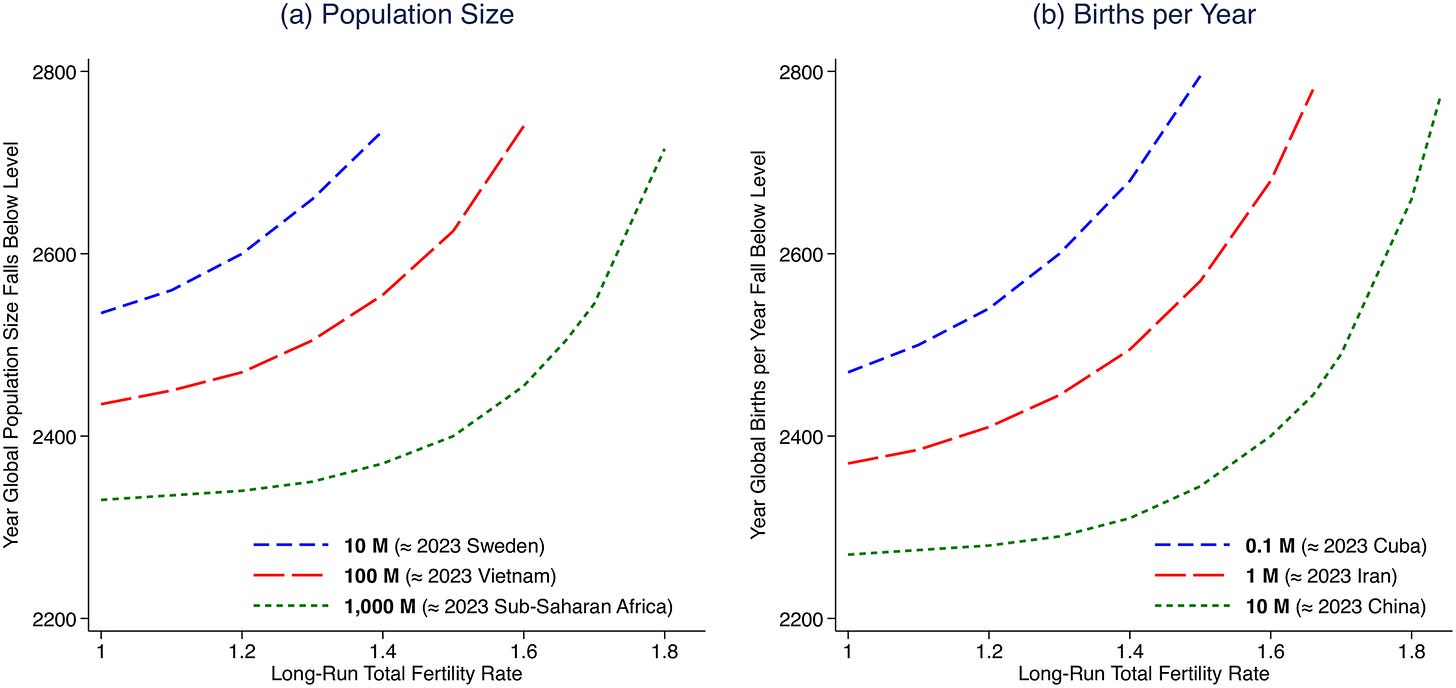 For a given long-term fertility rate — on the X-axes — the left panel shows the year in which global population drops to 1 billion, 100 million, and 10 million. You read that right. With a long-term fertility rate of 1.2, global population would drop to 1 billion in 2240 and to only 10 million people by 2500.1 The right panel shows the same but for births-per-year.