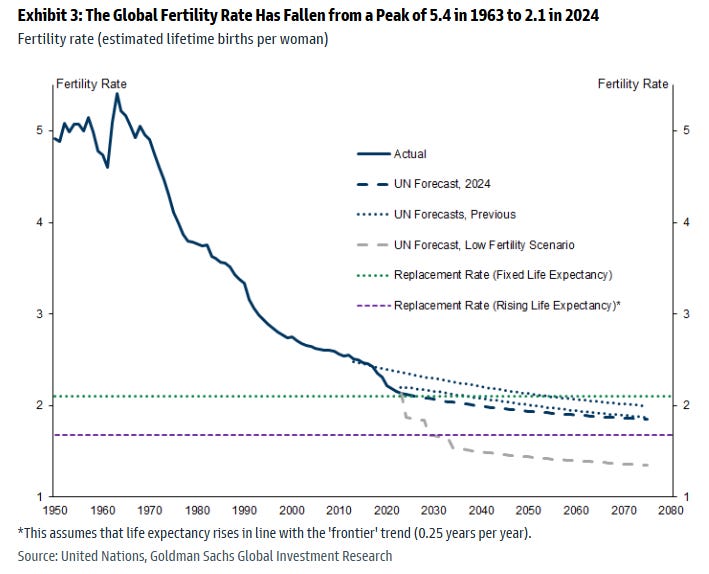 The figure from Goldman Sachs shows projected births per woman out to 2080, along with two estimates of replacement rates. The lowest projection is from the same UN low fertility scenrio shown above.