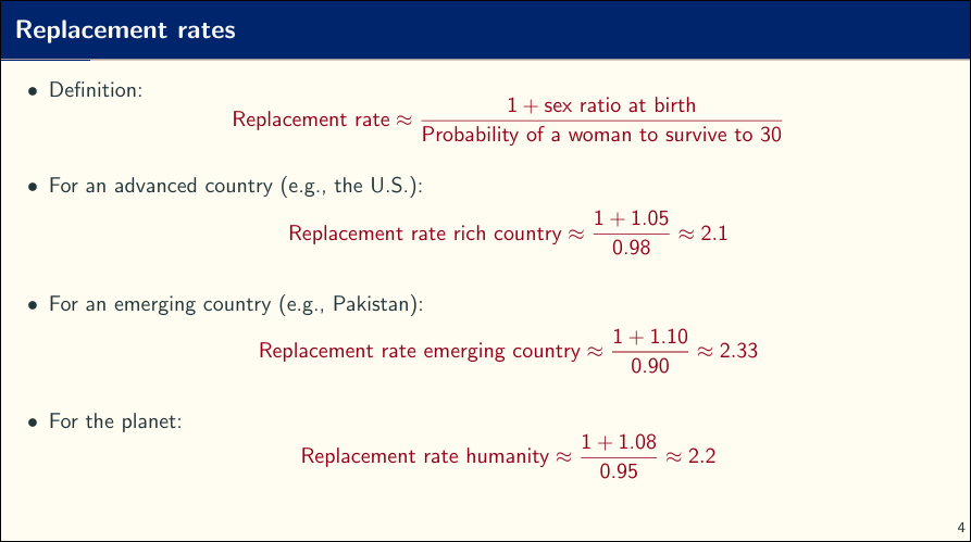 The replacement rate refers to the average number of children born to a woman required to sustain current population. The slide below from JFV’s talk explains required replacement rates.