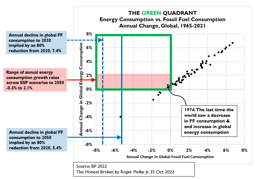 I welcome your feedback. Does this graph make sense? Is it clear? When might we expect to see the Green Quadrant filled with data indicating accelerated progress towards climate targets? Does this graph vindicate those calling for intentional degrowth or energy consumption restrictions in order to hit climate targets?