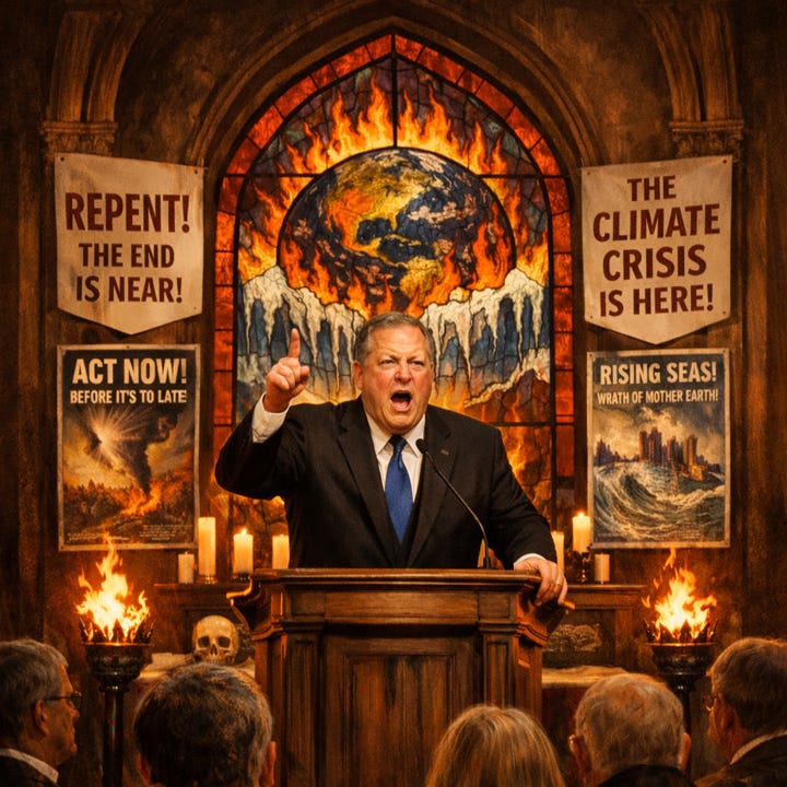 But even so, An Inconvenient Truth was not really about science; it was a sermon — complete with a moral arc (with those who are evil and those who are righteous), a clear account of sin (fossil fuel emissions), a warning of coming judgment (floods, storms, tipping points), and a path to redemption (political will, renewable energy, personal responsibility). The film ends with a call to conversion.