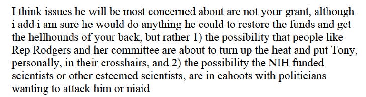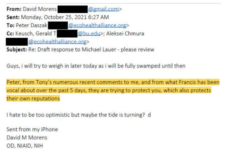 One curious statement in Moren’s emails that I want to focus on is an October, 2021 email that he sent to EHA president Peter Daszak, asserting that Tony Fauci (NIAID Director) and Francis Collins (NIH Director) were trying to “protect” Daszak in order to “protect” themselves: