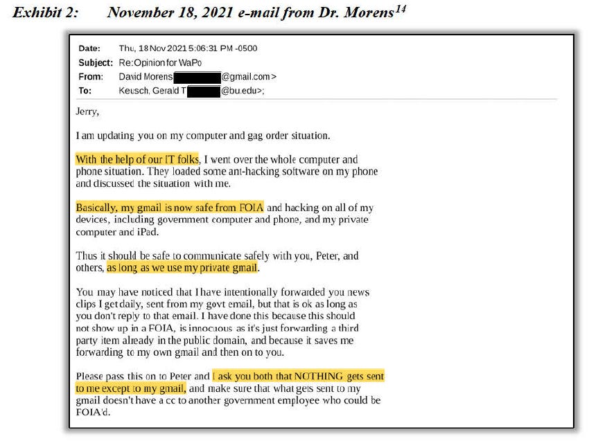 The full scope of Morens’ offenses — which include allegations of violating federal records retention laws, seeking to evade Freedom of Information Act (FOIA) requests, violating NIH scientific integrity policies, lying to Congress, and rank misogyny — can be seen in detail in this report from the House Select Committee released yesterday.