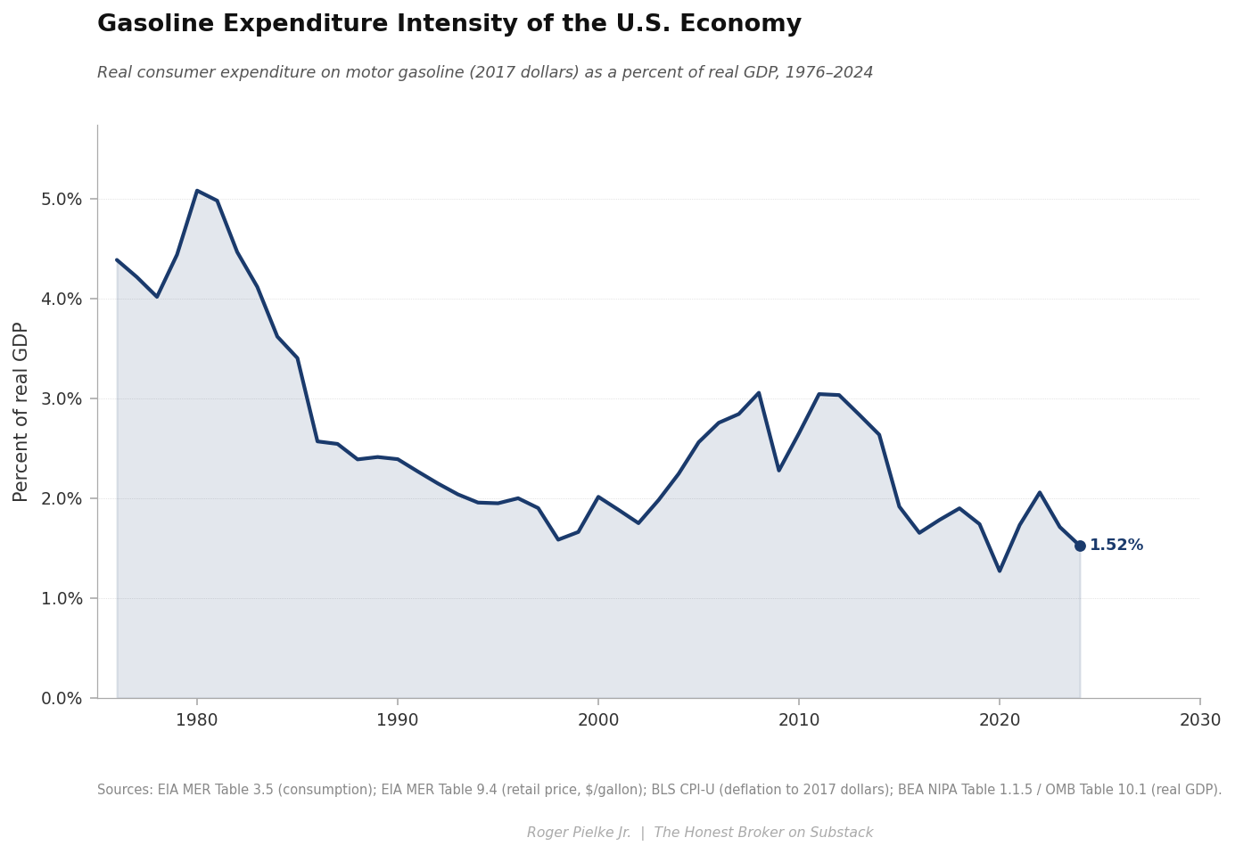Even though the past decade has seen a historically low share of gasoline spending in the overall U.S. economy, the post-COVID increase — from ~1.3% to ~2.0% — became politically salient, a topic I’ll return to in detail in Part Three.