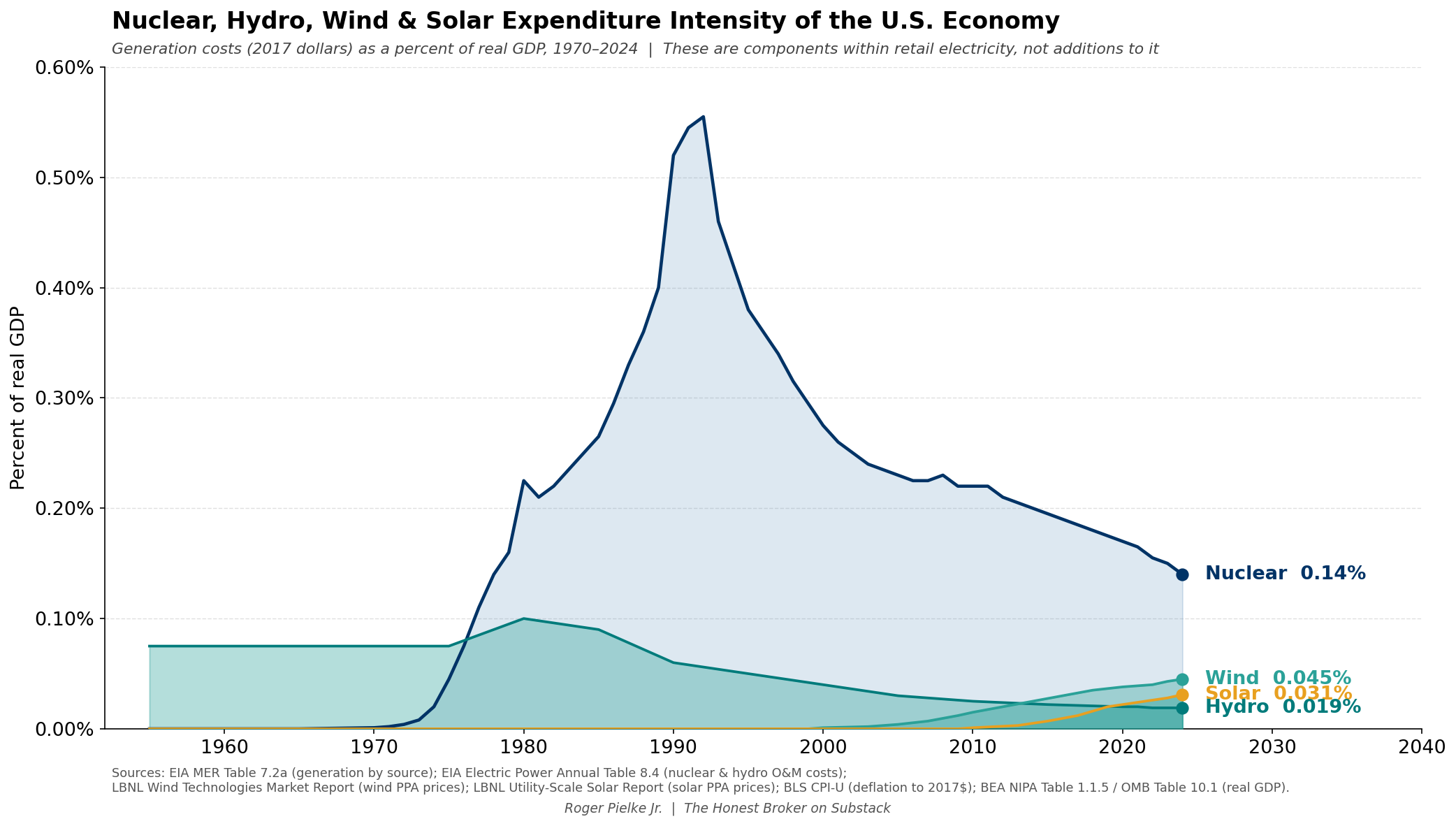 This is Part Two of a three-part series on The Shrinking Economic Weight of Energy. Part One looked at gasoline, natural gas, coal, and retail electricity. This post covers lower-carbon electricity sources — nuclear, hydro, wind, and solar — using the same two metrics: physical intensity (generation per dollar of real GDP) and expenditure intensity (cost as a percent of real GDP). Part Three draws bigger-picture lessons and will provide all data that underlies the series.