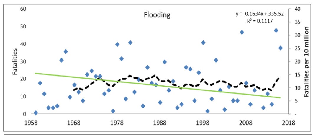 The figure above shows that as the population of Texas increased from ~9.2 million in 1958 to ~28.6 million in 2018, overall flood deaths remained fairly constant, meaning that the fatality rate dropped by about two-thirds.