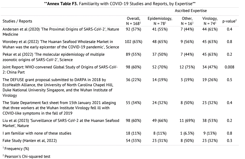 There is a little something there for everyone, and the results can be spun this way or that. But it gets more interesting. The survey asked participants whether or not they were familiar with key studies related to Covid origins. The results are shocking: