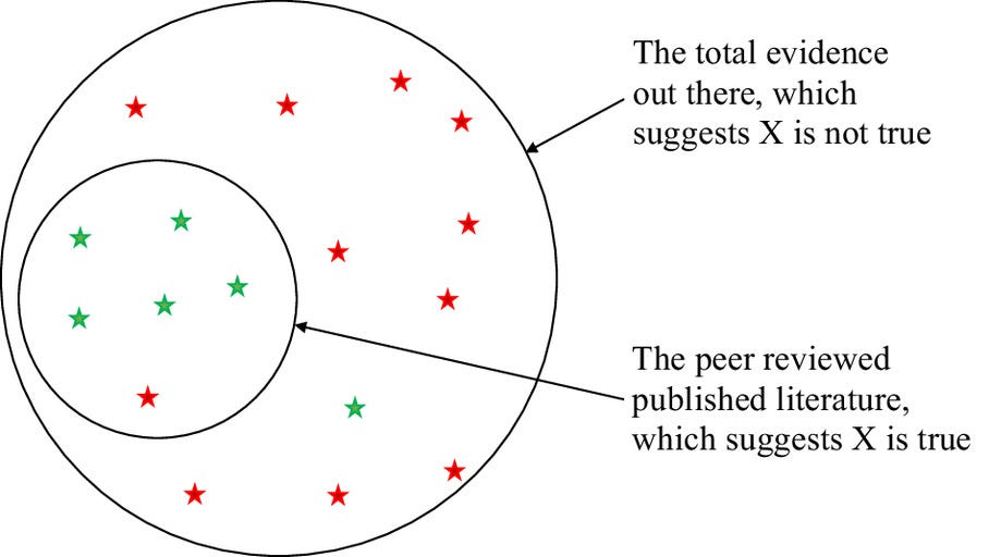 Clark et al. 2023: The potential epistemic consequence of scientific censorship. Green stars are evidence that X is true. Red stars are evidence that X is not true. Assume that each piece of evidence is equally weighty. Censorship that obstructs evidence against X will produce a peer-reviewed literature that concludes that X is true when most likely it is not.