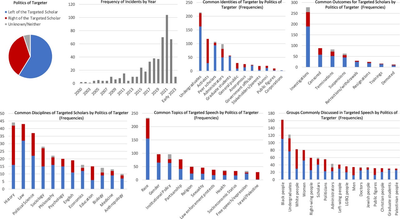 Clark et al. 2023: Characteristics of U.S. higher education scholars tracked by the Foundation for Individual Rights and Expression who were targeted for their pedagogy and/or critical inquiry between 2000 and June, 2023 (n = 486) and characteristics of their targeters.