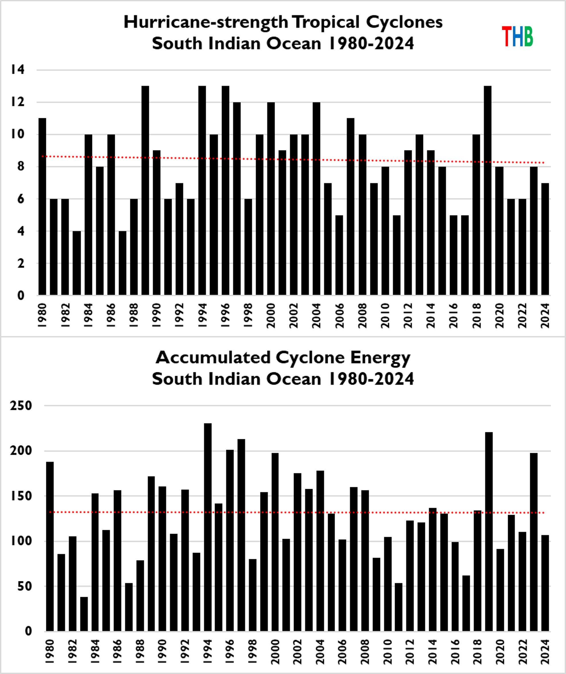 The figures below shows (top) the frequency of hurricane-strength tropical cyclones in the South Indian Ocean along with (bottom) accumulated cyclone energy (ACE), which integrates frequency and intensity — Neither shows a trend over 1980 to 2024.