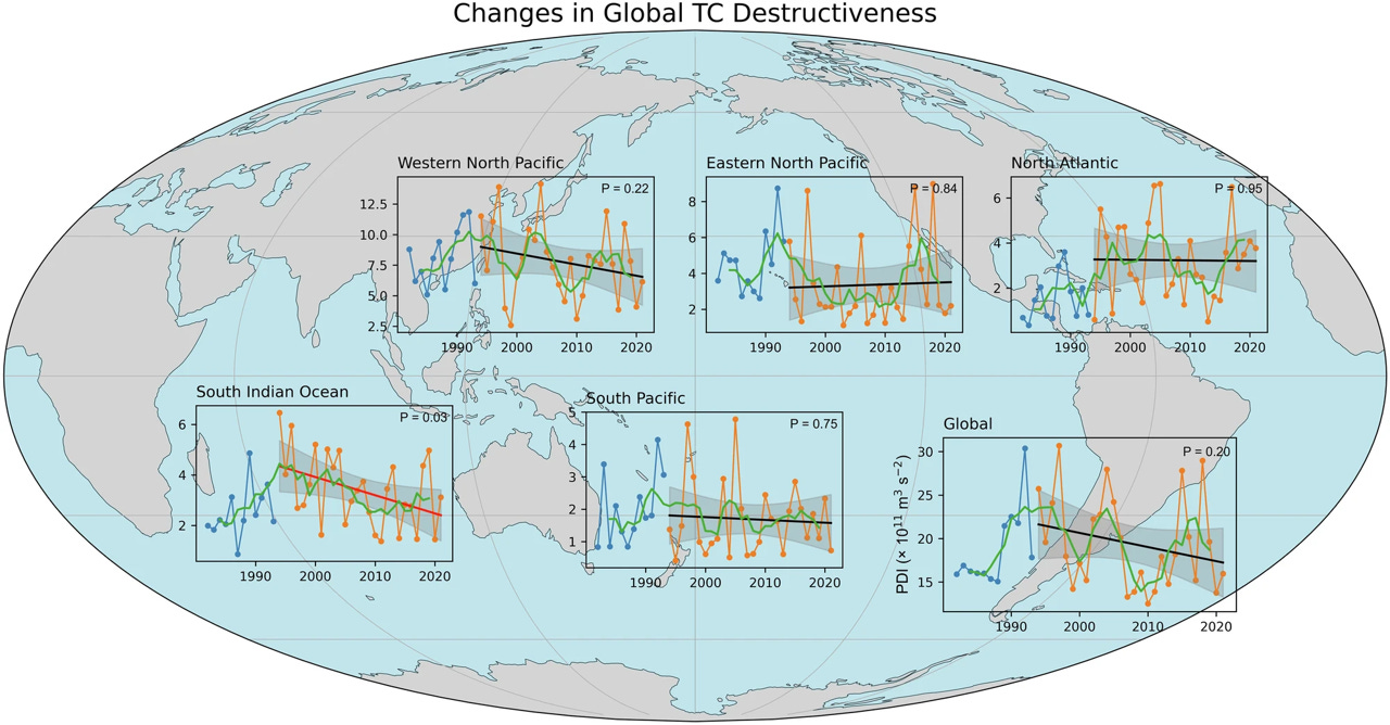 The figure above comes from a recent paper (Tu et al. 2024) titled — Decreasing trend in destructive potential of tropical cyclones in the South Indian Ocean since the mid-1990s. In fact, as you can see in the figure, in no ocean basin have tropical cyclones seen an increase in their destructive potential over the past 30 years.4
