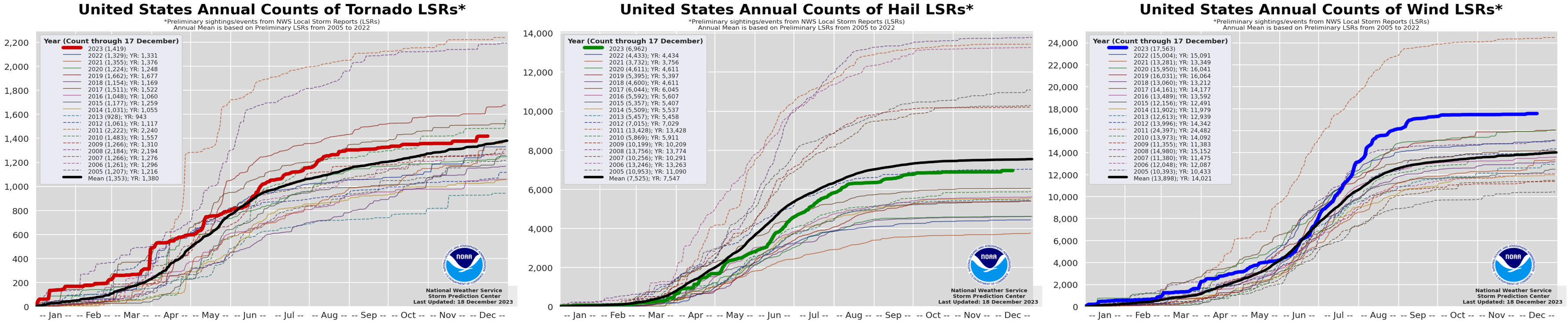 The figures above show from left to right, tornadoes, hail and wind local storm report counts, based on preliminary data for 2023. The data shows that tornadoes are a bit above the recent average and hail is a bit below. Winds, in contrast, were exceptionally high in 2023. Given that convective storms produce tornadoes, hail and winds, I am looking forward to how meteorologists explain these contrasting trends of 2023. Economic losses from hail and wind were quite large in 2023.