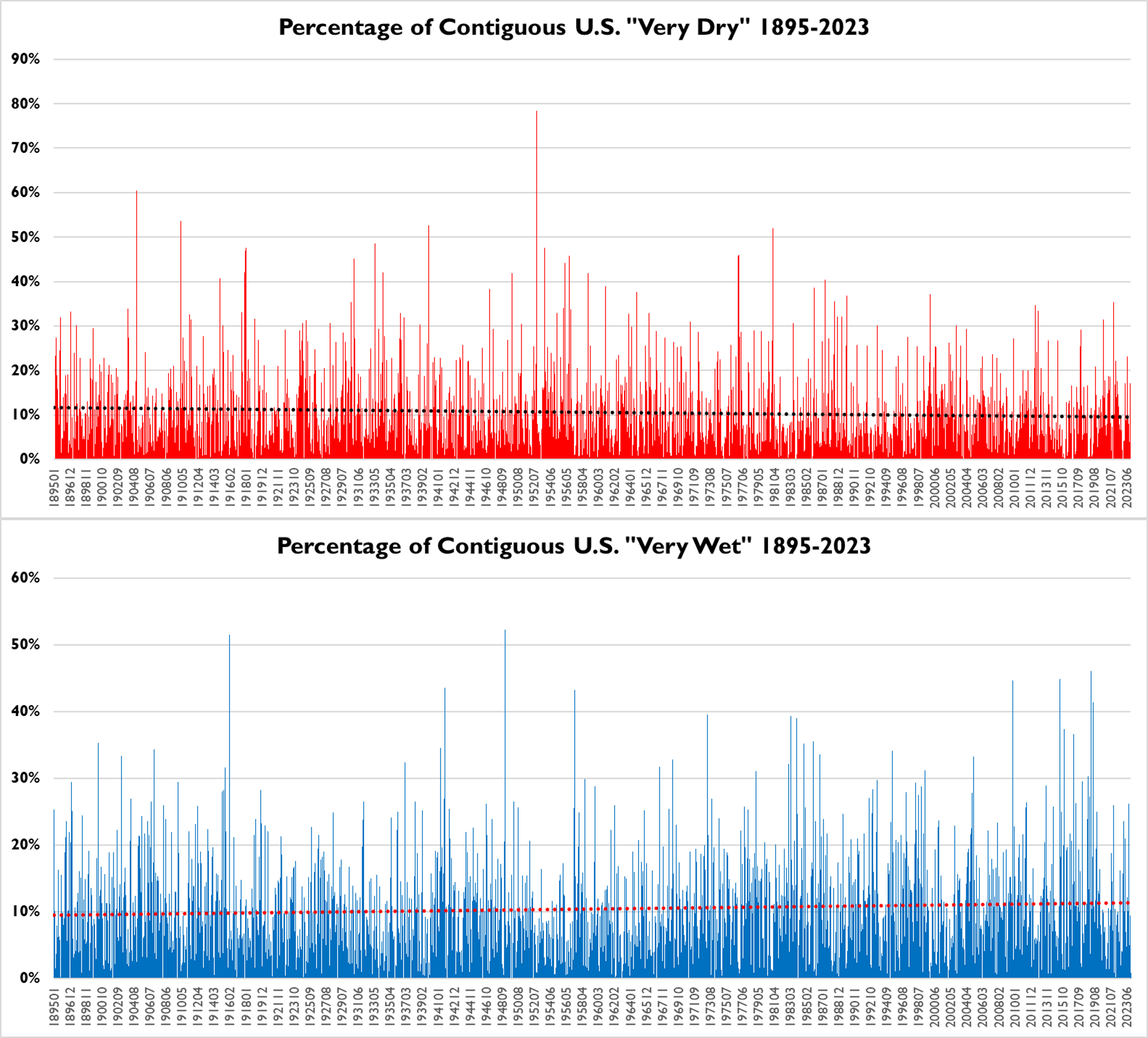 The figure below shows the proportion of US land area characterized as “very wet” and “very dry” from 1895 to 2023. If you squint, you can see that “very dry” has declined a bit, with extremes reduced dramatically since the 1950s, while “very wet” has increased, with more extremes since the 1980s. Fascinating, as Spock would say.