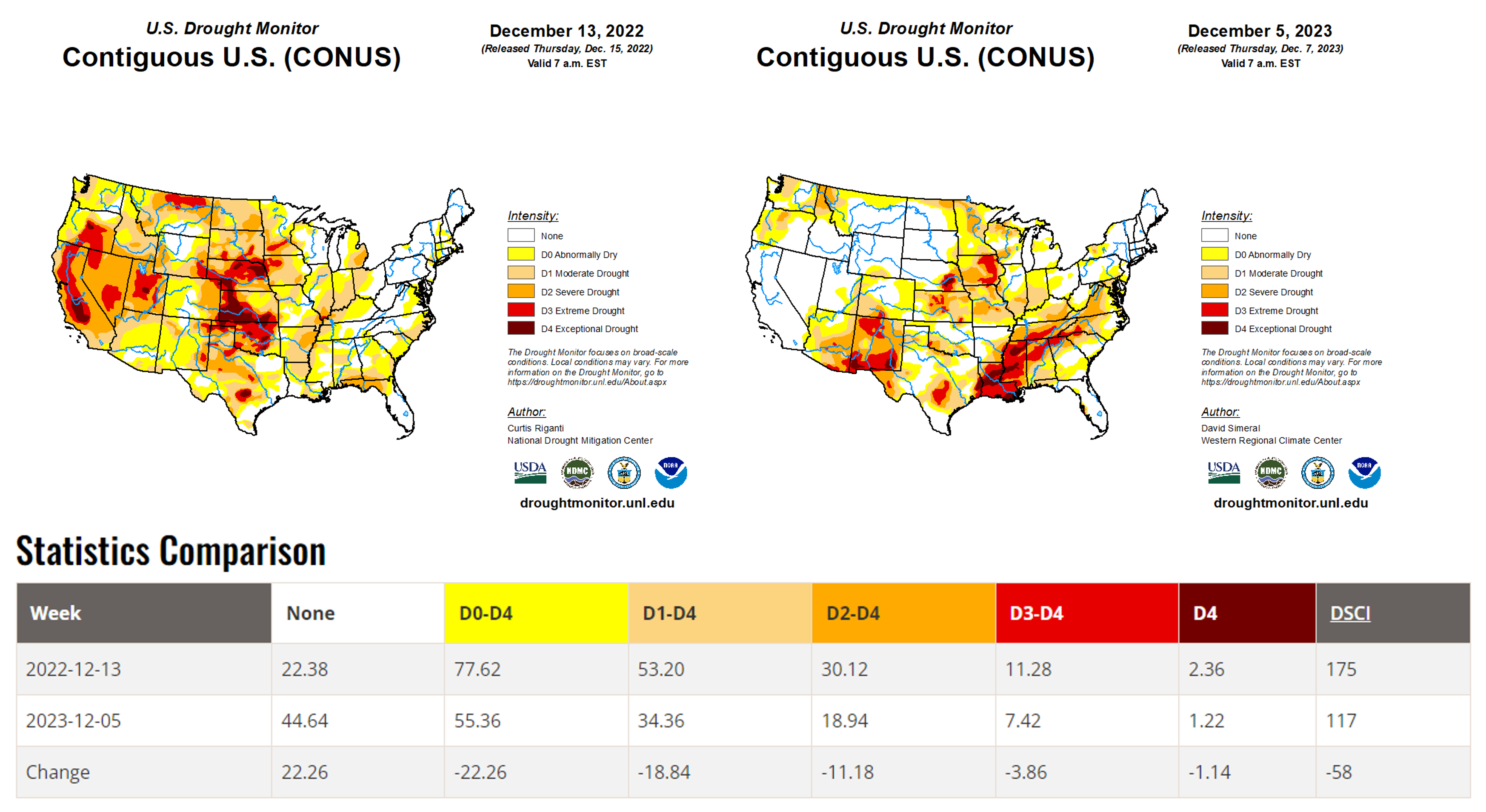 2023 was not particularly exceptional for drought in long-term context. In fact, compared to one year ago, 2023 has seen a markedly improvement in US drought conditions, as you can see below — with December 2022 on the left and December 2023 on the right. 2023 ends the year just about in the 50th percentile of months since 2000 for area under exceptional and extreme drought.