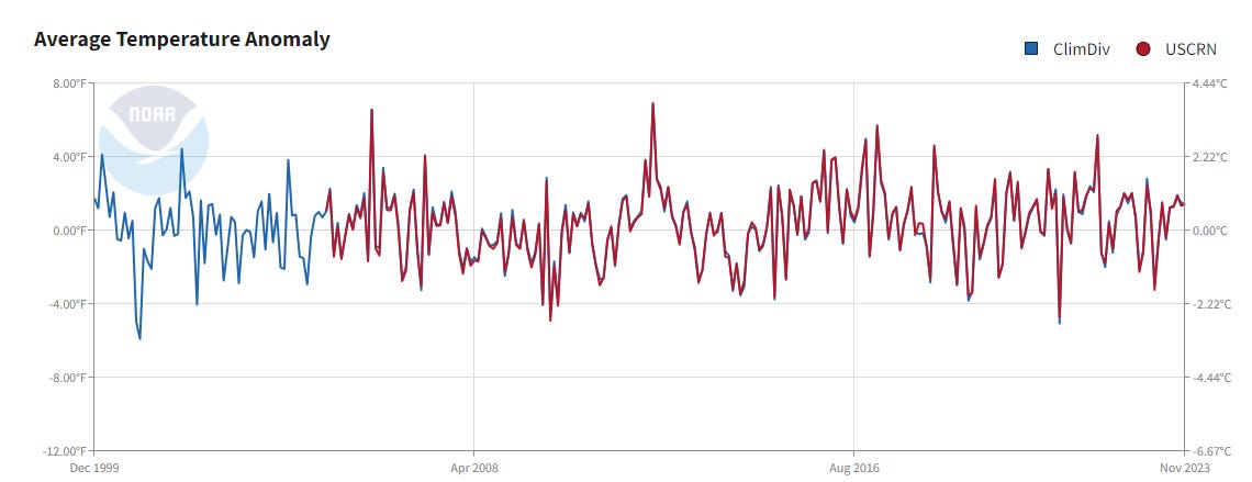 Month-by-month, 2023 ventured above and below the zero-line of the NOAA temperature anomaly time series. You can see from the figure above that there is no trend in this time series since December 2000, which is counter to what has occurred globally.
