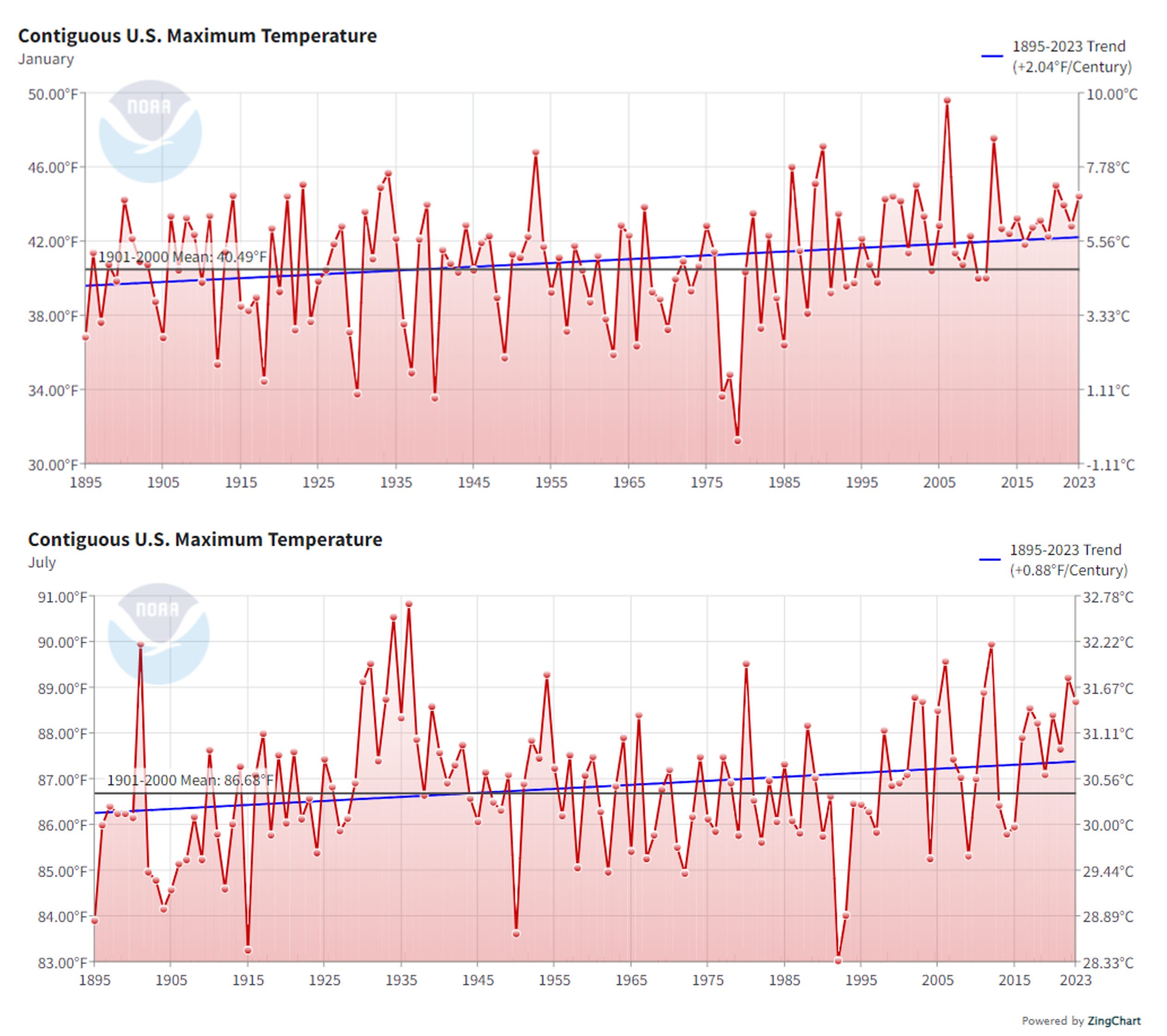 The figures above for January (top) and July (bottom) show clearly that maximum temperatures have increased since 1895 for both winter and summer, as is expected. July, 2023 was the 13th warmest July since 1895.
