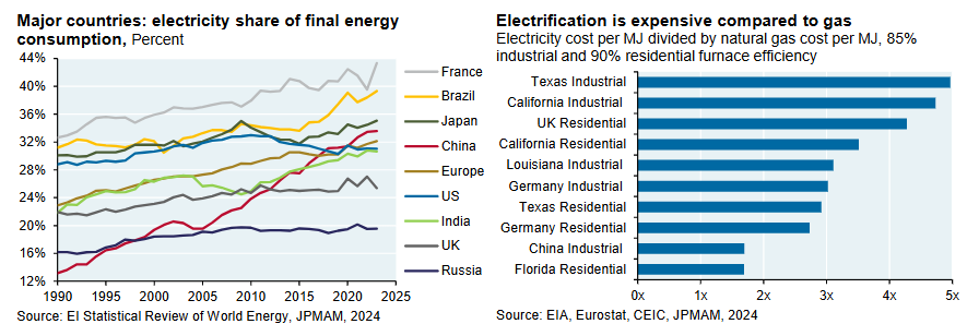 “The US is not unique with respect to the slow pace of electrification, although a few countries are making faster progress. Over the last decade China made the largest advance, bringing it in line with the OECD. Part of the challenge may simply be the long useful lives of existing industrial plants, furnaces, boilers and vehicles. In other words, electrification might accelerate as their useful lives are exhausted. But as shown on the right, the high cost of electricity compared to natural gas (particularly in places without a carbon tax) is another impediment to electrification that is not easy to solve since this ratio reflects relative total costs of production and distribution.”