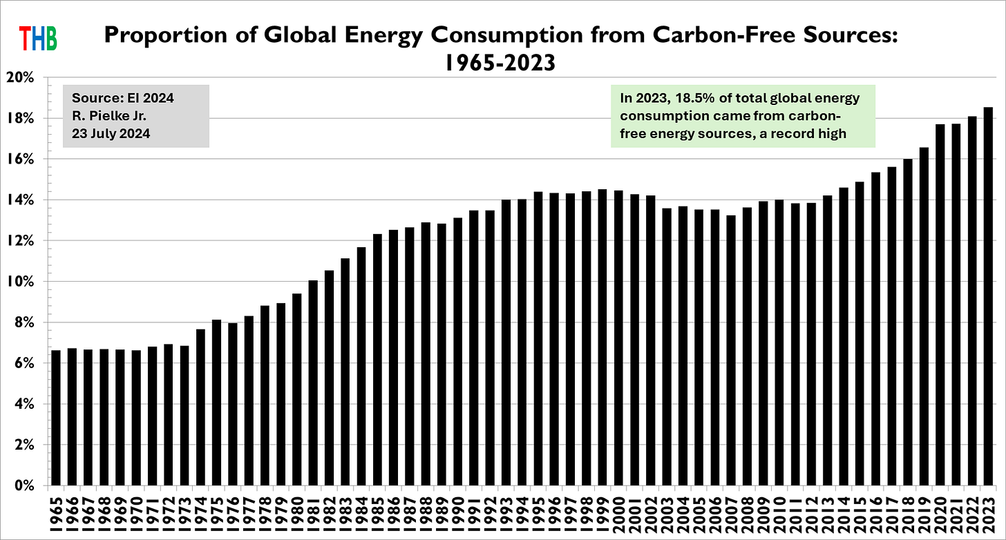 You can see that in the figure below — my graph using data from the 2024 EI Statistical Review of World Energy — which shows the proportion of global energy consumption from all carbon-free sources. Since 2012, that proportion has increased from about 14% to a bit over 18%. Exactly as Cembaest observes — that increase has been linear. At that rate of change the world would hit 100% carbon-free sometime after 2200.