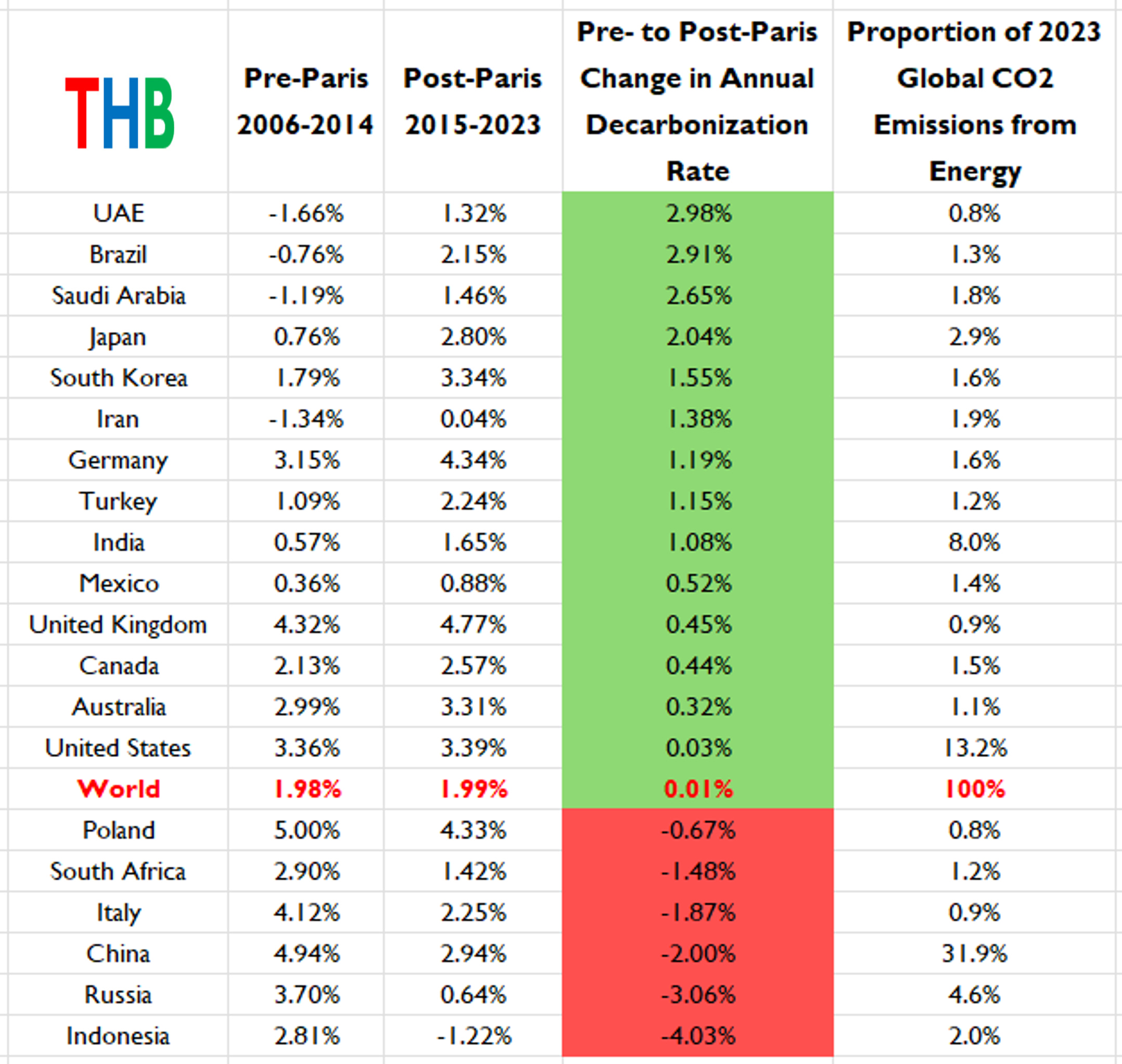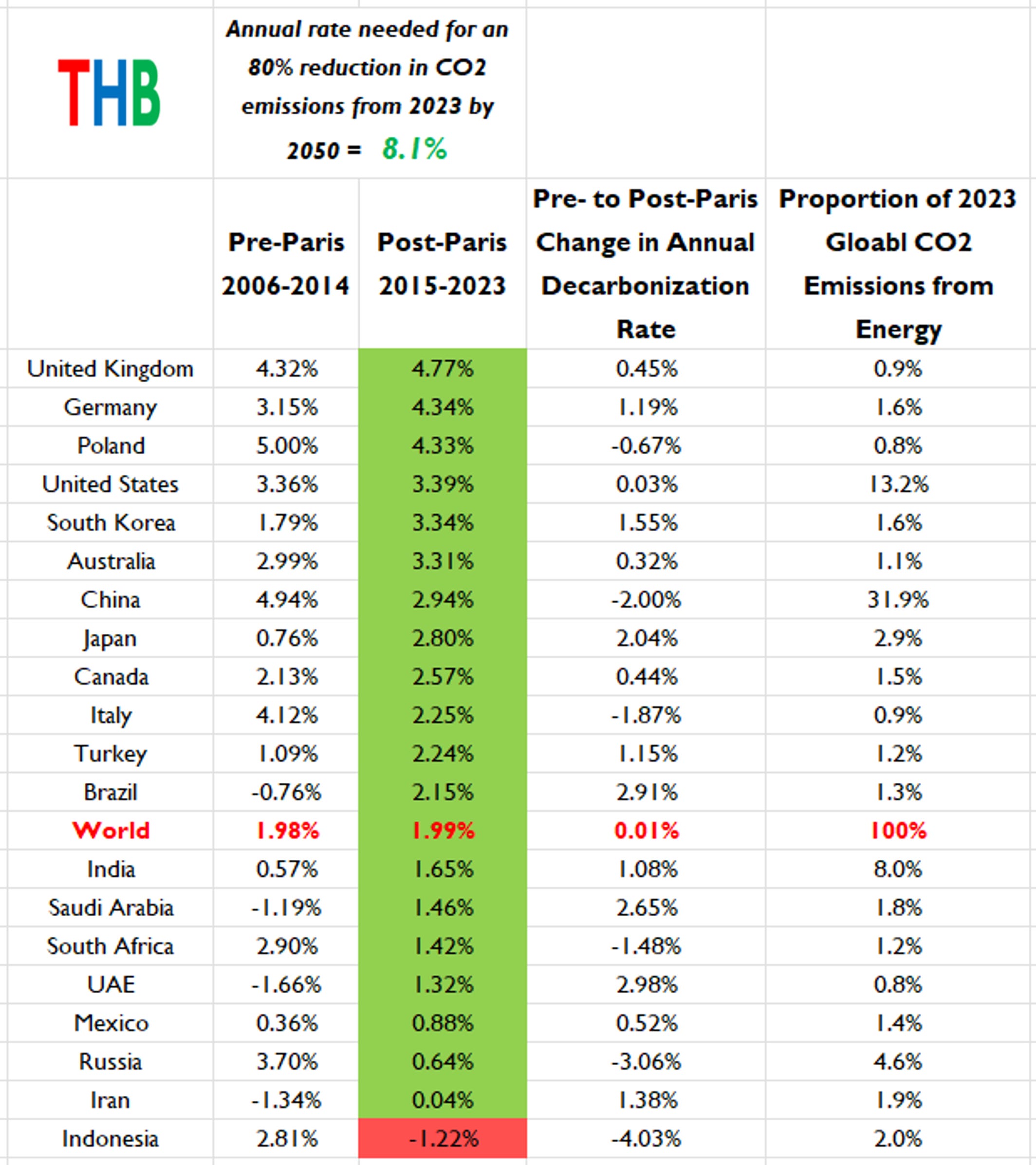 The table below presents the same data ranked by the annual rate of change in decarbonization rates from pre- to post-Paris.