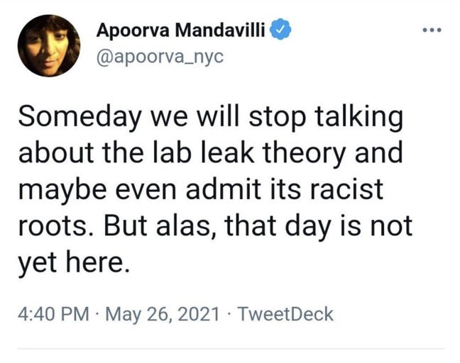Unfortunately, stopping discussion is often viewed as a feature not a flaw. For example, back in May 2021, in a Tweet (later deleted) following the Nature commentary linked above, a New York Times reporter who covers Covid-19 hoped that discussions of a lab leak possibility would stop, explicitly associating anyone who talks about the “lab leak theory” with being a racist: