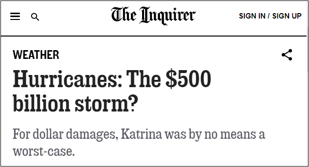 In a 2005 presentation to the American Geophysical Union, I argued that by 2025, future coastal development and economic growth could lead to a $500 billion hurricane. That projection was featured in the New York Times and other major media (this was back when our normalization work was routinely featured in the media — that is no longer the case):