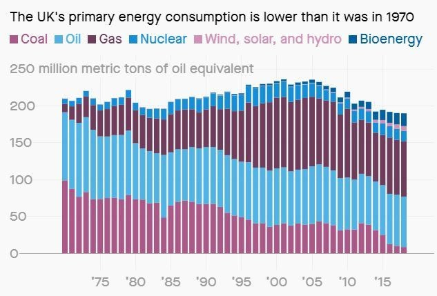 You can see in the figure below that overall energy consumption in the UK decreased significantly after 2005, mainly due to the changing composition of the UK economy and slow growth. Other factors that I did not consider are the accounting rules associated with bioenergy (e.g., burning imported wood) and energy supply from Europe.