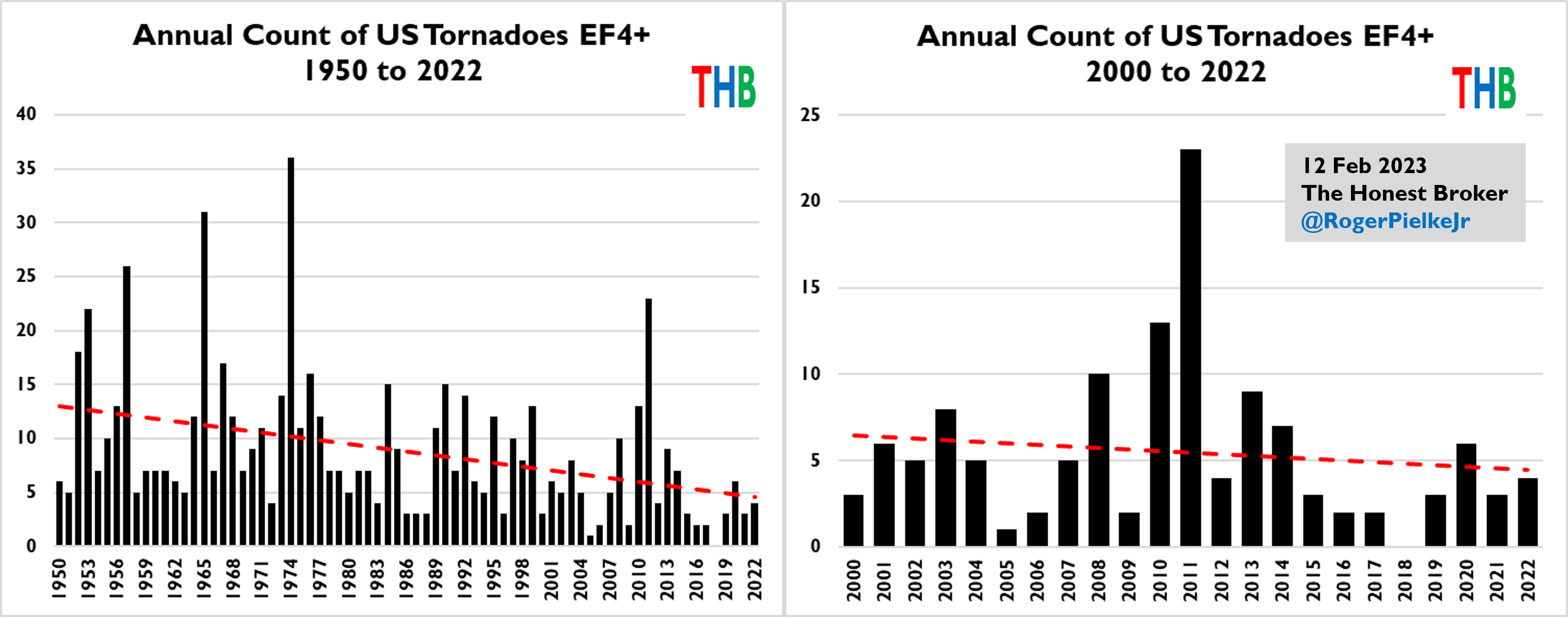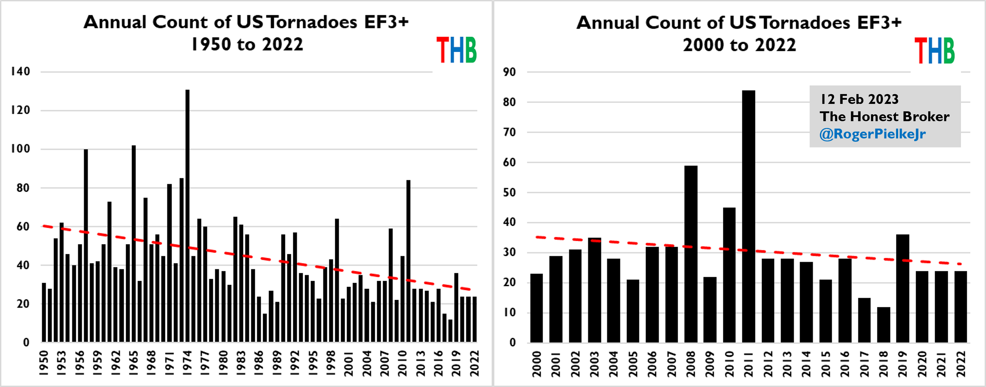 The panel on the left shows reported EF3+ tornadoes from 1950 to 2022 and it indicates a dramatic decline, from about 60 per year to about 30. The figure on the right shows the same data for 2000 to 2022, also indicating a decline in incidence over the more recent period.