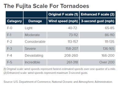 Tornadoes are classified by their intensity according to the 6-category Enhanced Fujita (EF) Scale, which runs from 0 to 5, and is shown in the table above (alongside the original Fujita Scale). The U.S. National Weather Service (NWS) explains that “The Enhanced F-scale still is a set of wind estimates (not measurements) based on damage.” You can read about the EF Scale and its history here and here.