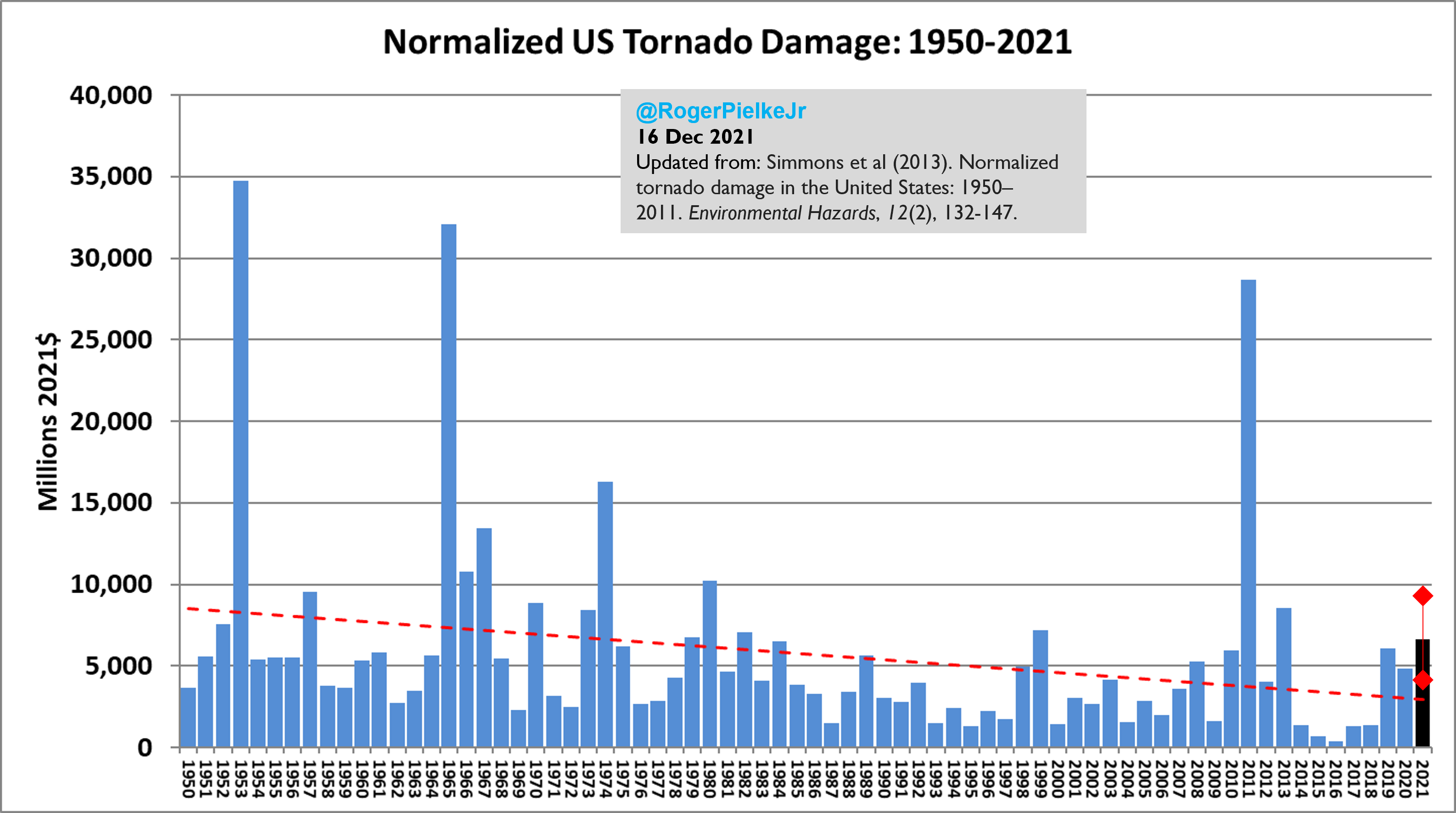 In a 2013 paper, Kevin Simmons, Daniel Sutter and I used the EF Scale in a set of normalizations of U.S. tornado damage from 1950 to 2011 to account for changing wealth, population, and housing. You can see a recent update of our analysis through 2021 in the figure below and discussed in some detail here.