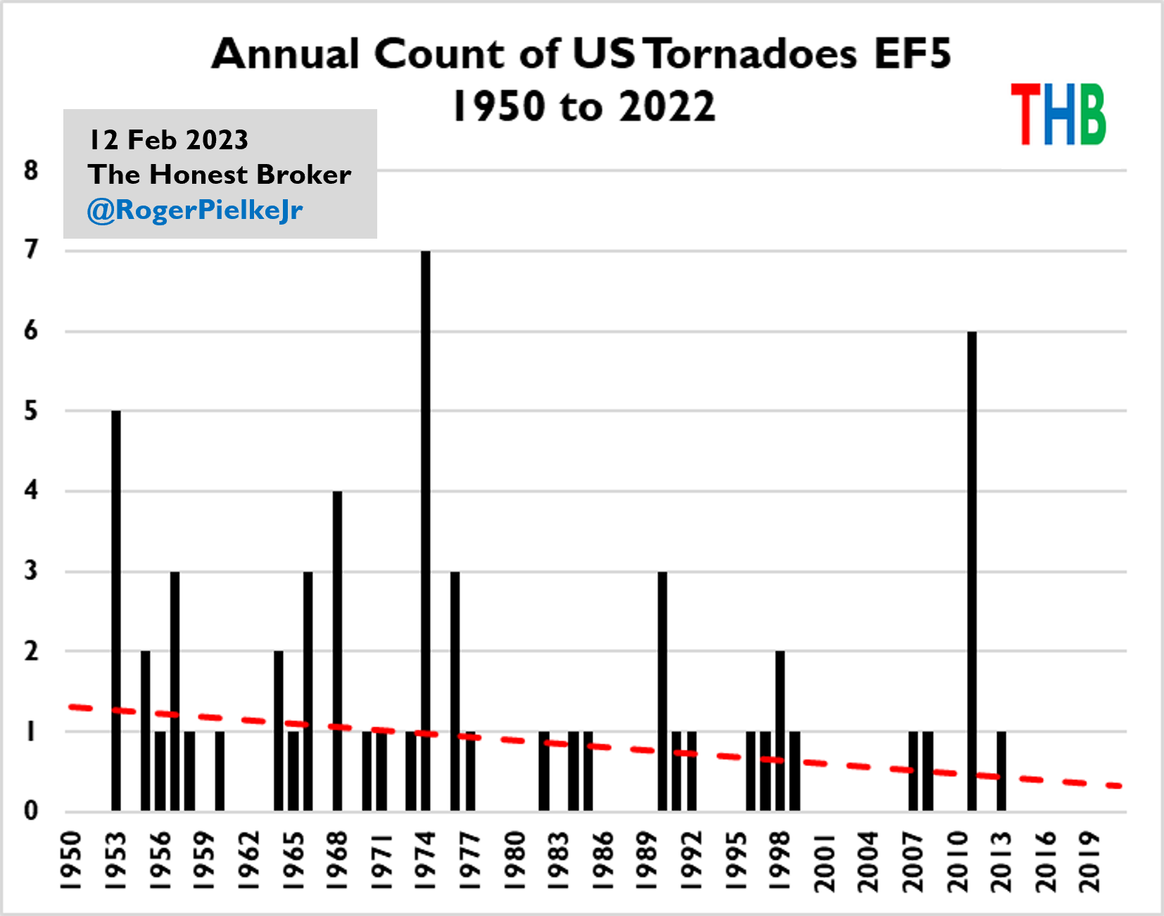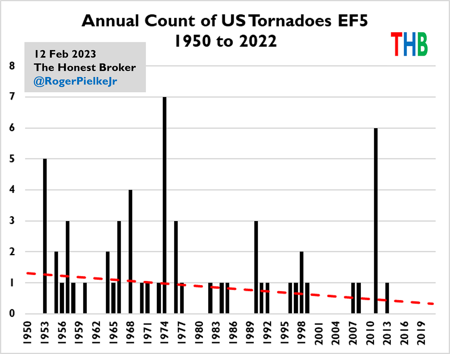 Here we also see declines over the longer (1950 to 2022) and more recent (2000 to 2022) periods. For completeness, let’s also look at the very rare EF5 tornadoes.