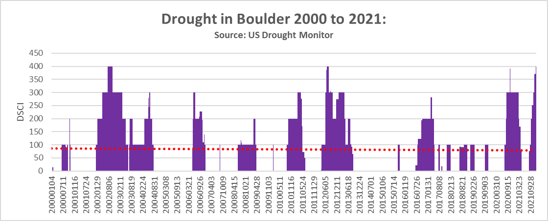 Distal causality. This refers to the underlying or background conditions that may have set the stage for the fire. Among the potential factors of distal causality: regulations and enforcement of open burning and decisions in the preceding months and years about prescribed burns in the public open space neighboring the communities. More fundamental decisions that set the stage for the disaster go back years and even decades, such as the initial decisions to create large areas of public open space on the edge of tightly built neighborhoods. And of course, considerations of human-caused climate change (and of course climate variability) as a factor in loading the fuel source (either via a wet spring that led to grass growth or the subsequent dry summer and fall which dried it out). The figure below shows a time series of drought in Boulder, CO for 2000 to 2021, via the US Drought Monitor.