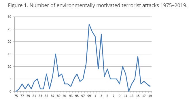 One academic analysis finds that environmentally-related terrorism peaked several decades ago and generally declined through 2019, as you can see in the figure below.